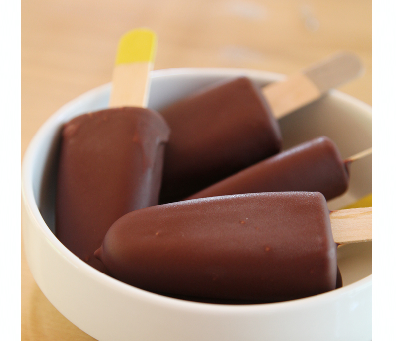 – Sortir vos esquimaux à la dernière minute, les démouler, puis les tremper dans un verre de haut rempli de chocolat. L’opération doit être rapide. Maintenir l’esquimaux la tête en bas et au bout de 3 secondes vous obtiendrez un magnifique esquimau qui n’a rien à envier aux magnums.